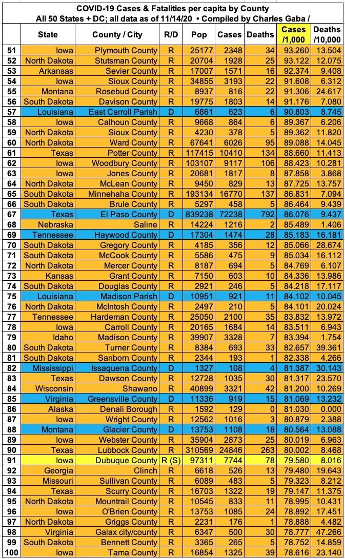 With these updates in mind, here's the top 100 counties ranked by per capita COVID-19 cases as of Saturday, November 14th (click image for high-res version). Blue = Hillary Clinton won by more than 6 points; Orange = Donald Trump won by more than 6 points; Yellow = Swing District