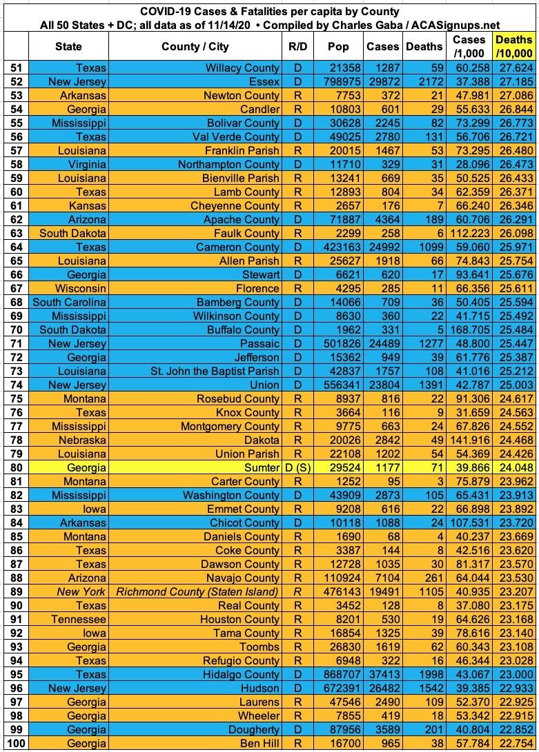Here's the top 100 counties ranked by per capita COVID-19 fatalities as of Saturday, November 14th (click image for high-res version):