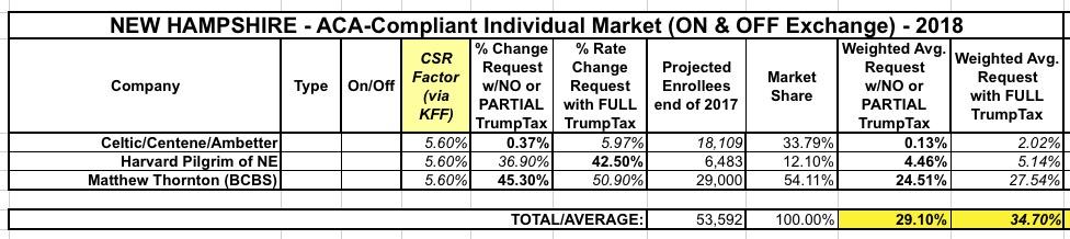 ALSO NOTE: Going forward, I'm changing the "WITHOUT TrumpTax" label to "w/PARTIAL TrumpTax" because some carriers don't break out their "HHS mandate enforcement uncertainty" factor even if they break out the "assume no CSR reimbursements" factor. This means that the "Without" average is actually somewhat lower than shown overall, but I have no way of estimating how much lower, though my guess is it'd be perhaps 2 points or so overall.