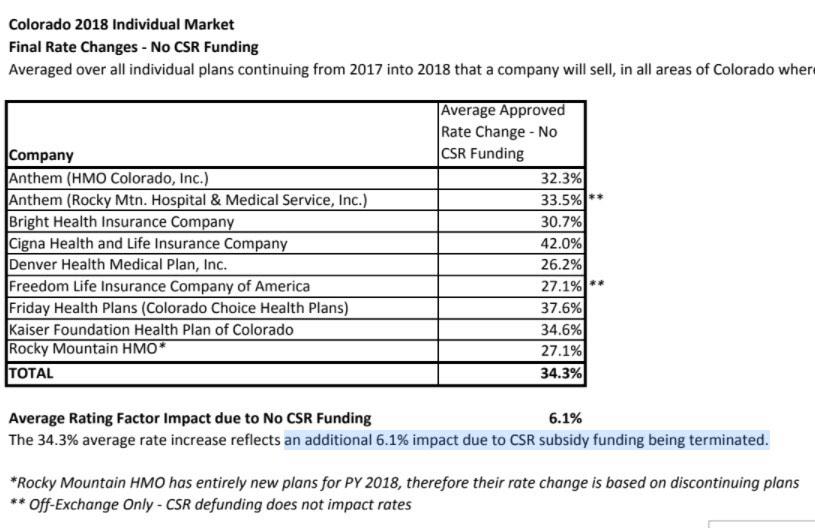 Today I checked in with the Colorado DOI again, and they've posted the official, presumably final rate increases, assuming no CSR funding: