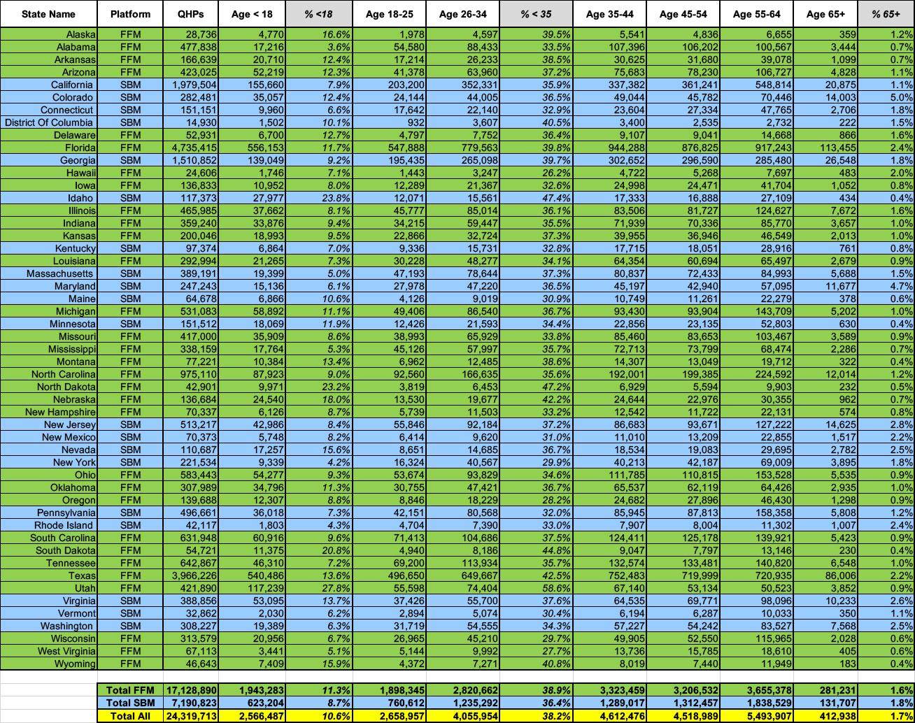 Alabama has the lowest percent of enrollees under 18 (3.6%), while Utah has the highest (27.8%) which I guess makes sense since Utah has the youngest median-aged population in the country. Similarly, Utah has the highest percent of enrollees under 35 (58.6%) vs. Hawaii's 26.2% (lowest).