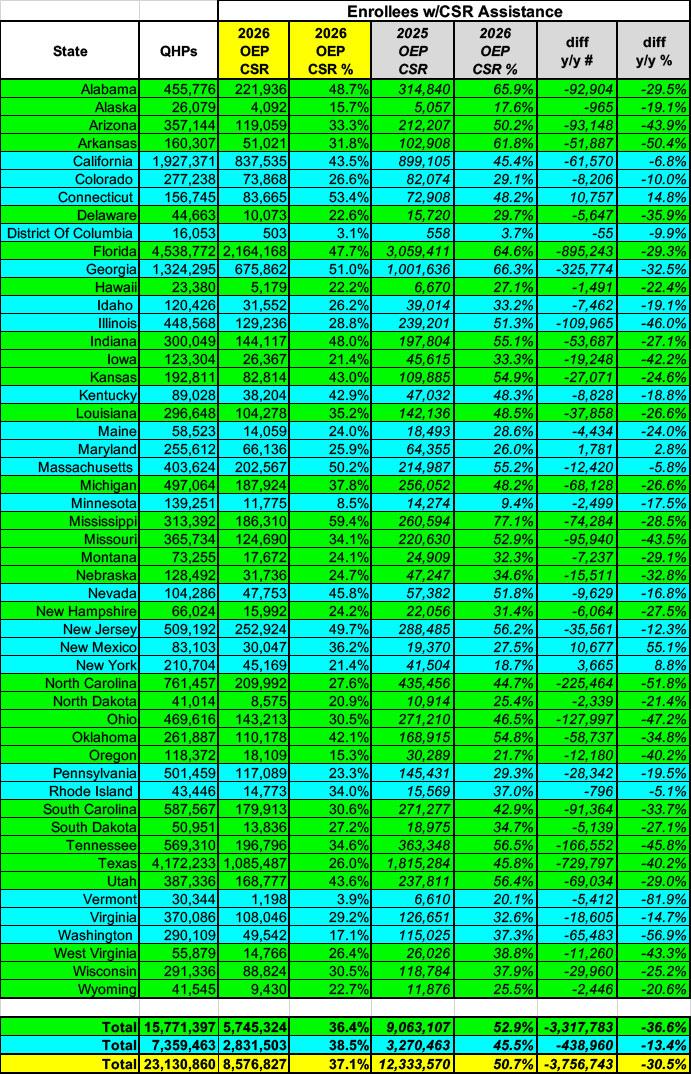 Next, here's the breakout of Cost Sharing Reduction (CSR) assistance by state compared against last year. Tragically, there's been a dramatic drop in both the number and percentage of enrollees receiving CSR help, from over 50% (12.3 million in 2025 to just 37% (8.6 million) this year.