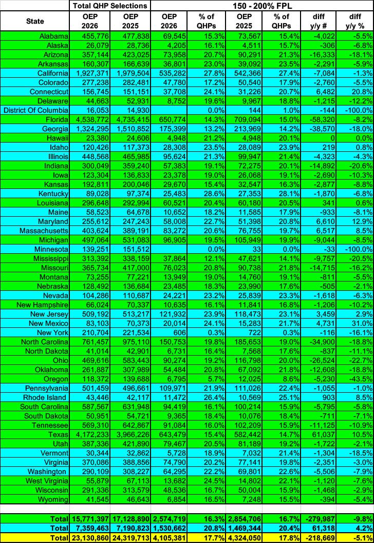 Combined, enrollment in the 100 - 200% FPL range dropped by over 415,000 people, or 2.7% nationally, although there are 16 states where it actually increased, and 5 states (all blue, all operating their own exchanges) where it increased by double digits: