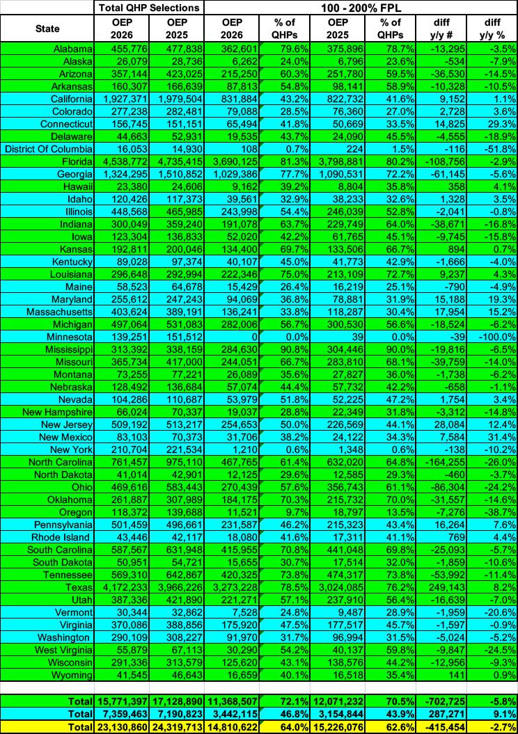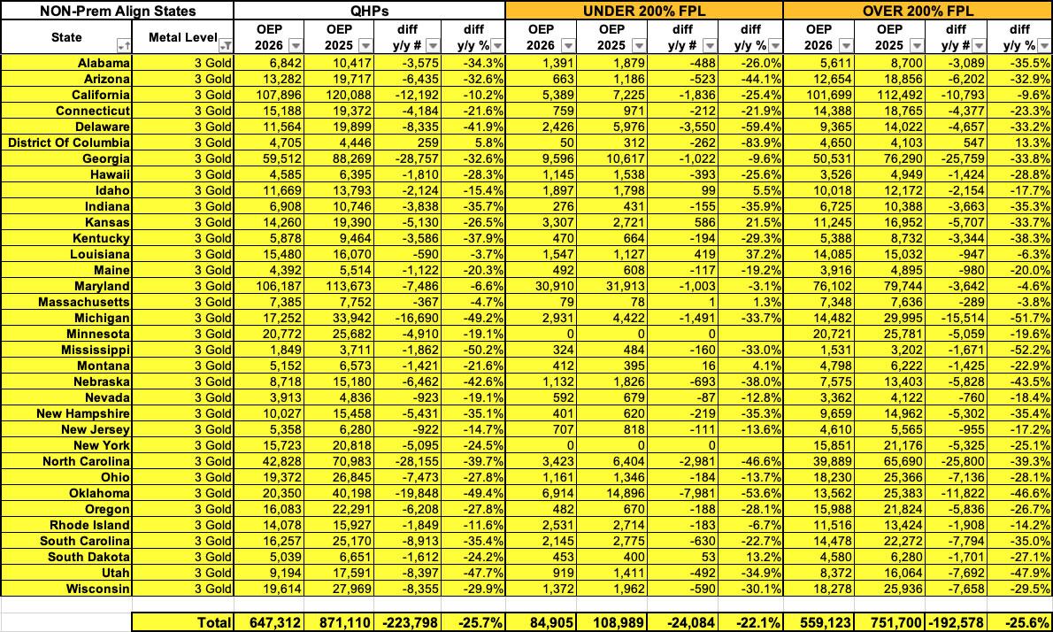 Update 4/11/26:  I had Arkansas in the wrong table below; both have been corrected, as have the bullets above, which only makes my point stronger. In addition, notice how in Arkansas, Illinois & Washington State (the three states which newly-implemented Premium Alignment policies this year), Gold enrollment shot up at an even more dramatic rate (anywhere from 10x to 52x higher below 200% FPL). In addition, h/t to Andrew Sprung for pointing out that these are also the only states where it increased over 200% FPL to a significant degree.