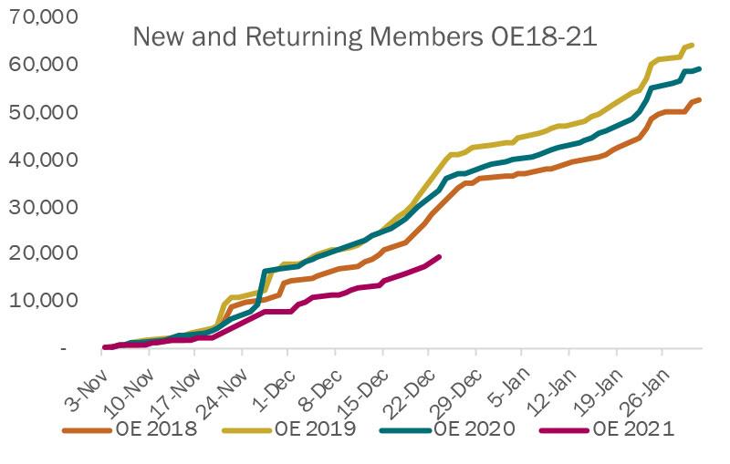 - Staff and partners continue to work to conduct outreach, marketing, and member support on OE to maximize public and member awareness