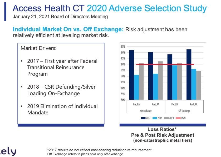 - Loss Ratios after consideration of risk adjustment transfers indicates that on exchange enrollees are currently not financially disadvantaged.