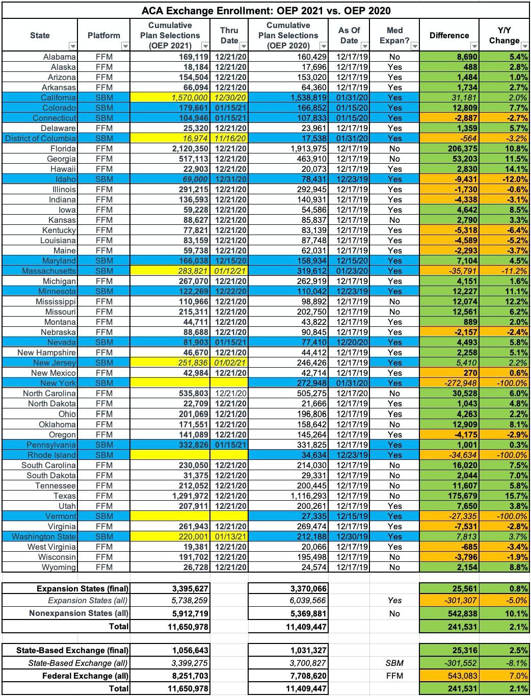 I just realized that while I've broken out state-level 2021 Open Enrollment data between Medicaid expansion & nonexpansion states, I haven't posted the state-level 2021 vs. 2020 data in a single table yet, so I'm rectifying that today. Note that this still only includes partial data for 5 states (CA, DC, MA, NJ & WA) and no data at all for 3 others (NY, RI, VT).