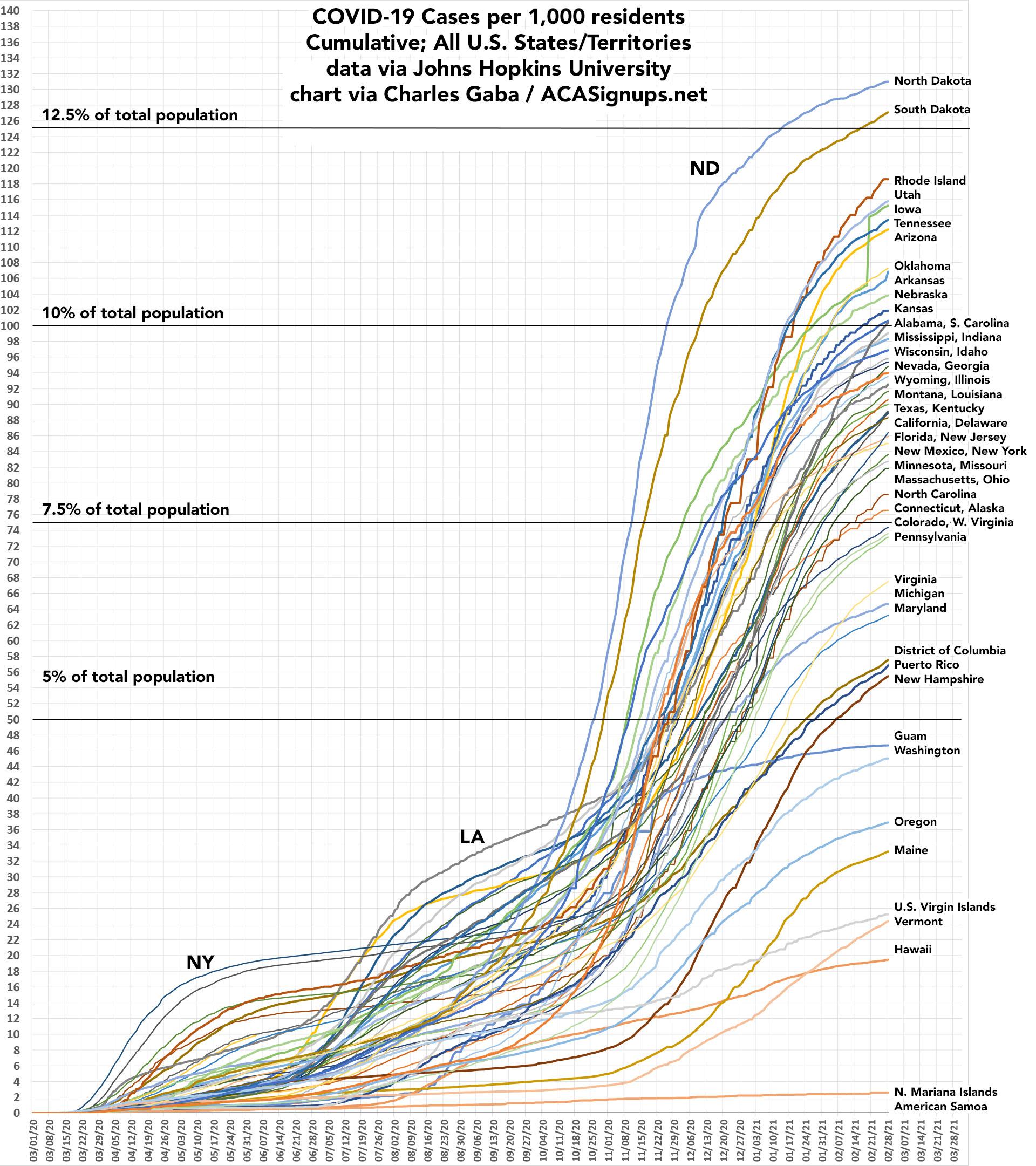 I've done my best to label every state/territory, which obviously isn't easy to do for most of them given how tangled it gets in the middle. For cases per capita, the most obvious point is that New York and New Jersey, which towered over every other state last spring, are now dwarfed by North & South Dakota, although things are pretty horrible nearly everywhere now.
