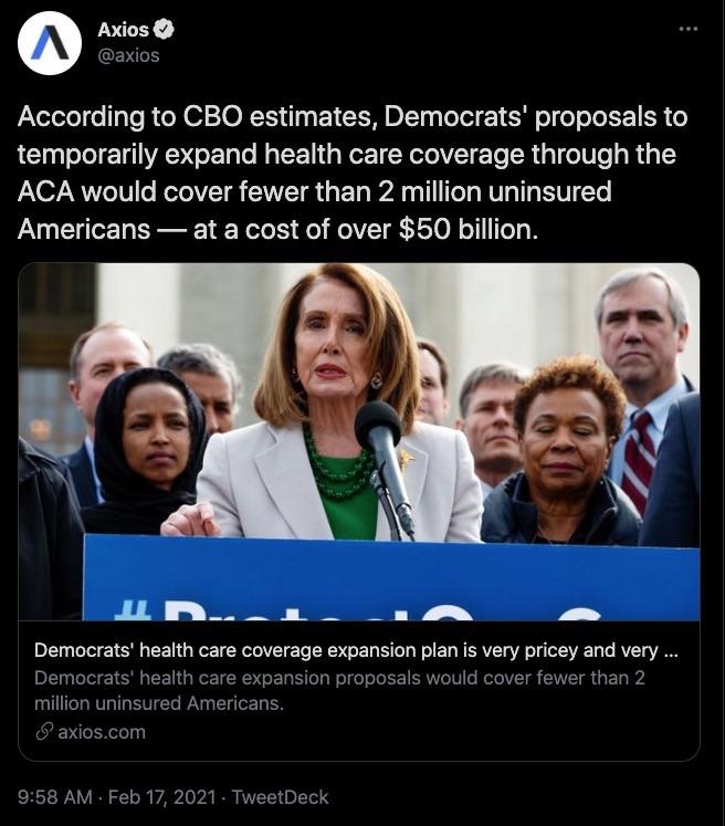 According to CBO estimates, Democrats' proposals to temporarily expand health care coverage through the ACA would cover fewer than 2 million uninsured Americansat a cost of over $50 billion. https://t.co/oAuMMOOXwf