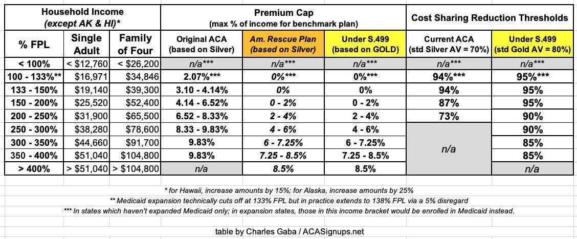 Here, again, is a table summarizing how the current ACA subsidy structure works for both premiums and cost sharing (deductibles, co-pays & coinsurance); how the American Rescue Plan has temporarily beefed up the premium subsidies; and how both would look under S.499's permanently expanded subsidy structure for both premiums & cost sharing reductions: