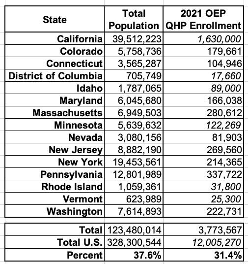 ...States operating their own State-Based Marketplace (SBM) that do not use the HealthCare.gov platform are not included in the analysis: California, Colorado, Connecticut, District of Columbia, Idaho, Maryland, Massachusetts, Minnesota, Nevada, New Jersey, New York, Pennsylvania, Rhode Island, Vermont, and Washington.