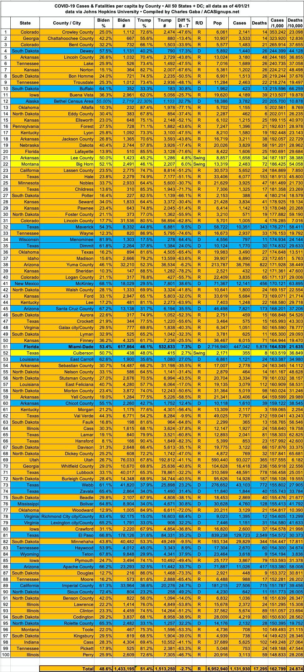 Here's the top 100 counties ranked by per capita COVID-19 fatalities as of Thursday, April 1st, 2021 (click image for high-res version):