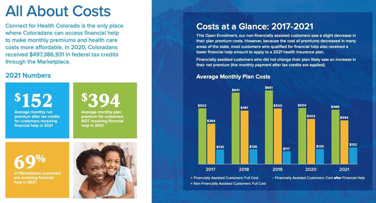 - People who use Connect for Health Colorado can qualify for financial help and save money on health insurance costs. On average, people who qualified for financial help for this year are paying $152 per month for their health insurance coverage.