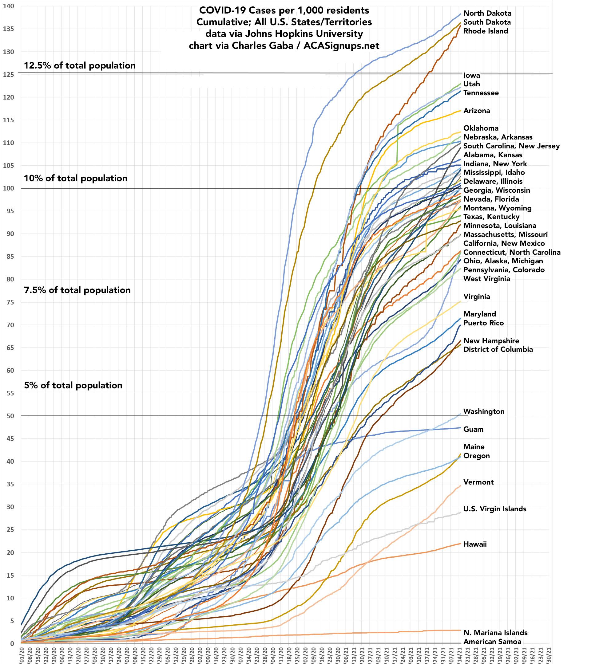 More than 1 out of every 8 residents of North Dakota, South Dakota and Rhode Island have tested positive for COVID-19 over the past year.