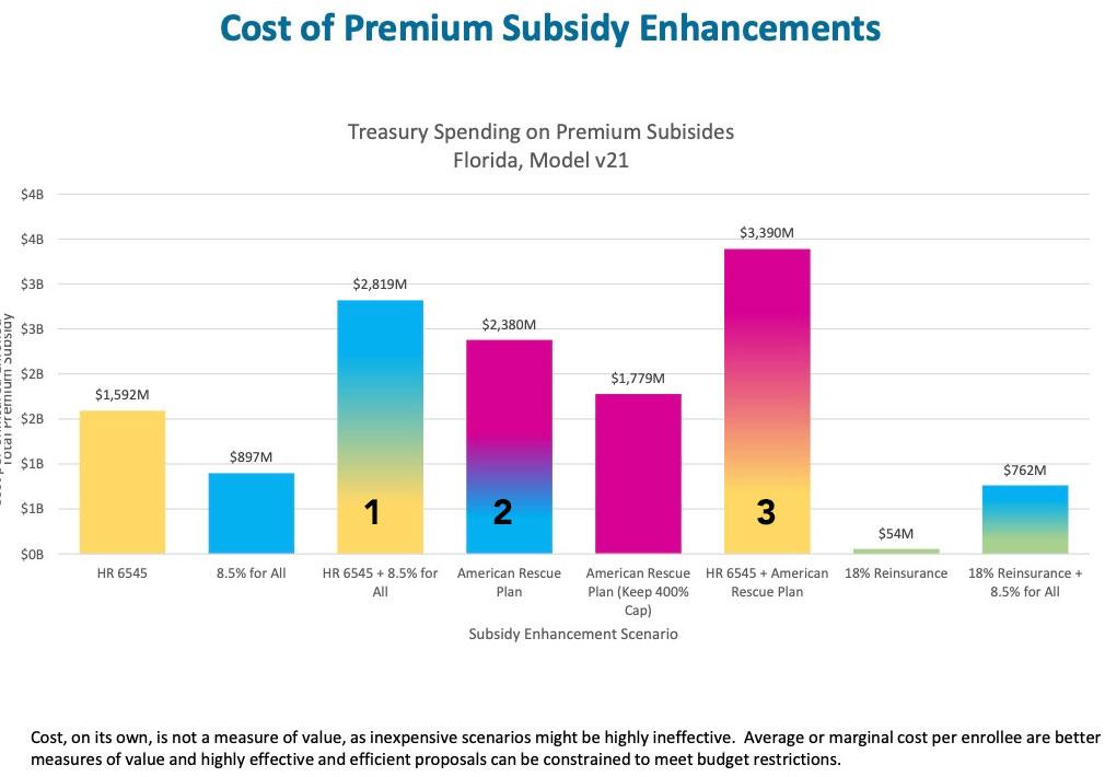 According to this analysis, in Florida, ARP/369 as it stands would increase the amount of subsidies spent per total exchange enrollee (including currently subsidized enrollees) by around 16%, which wouldn't be bad for a 19% increase in ACA exchange enrollment (I'm assuming 2.0 million is the baseline).