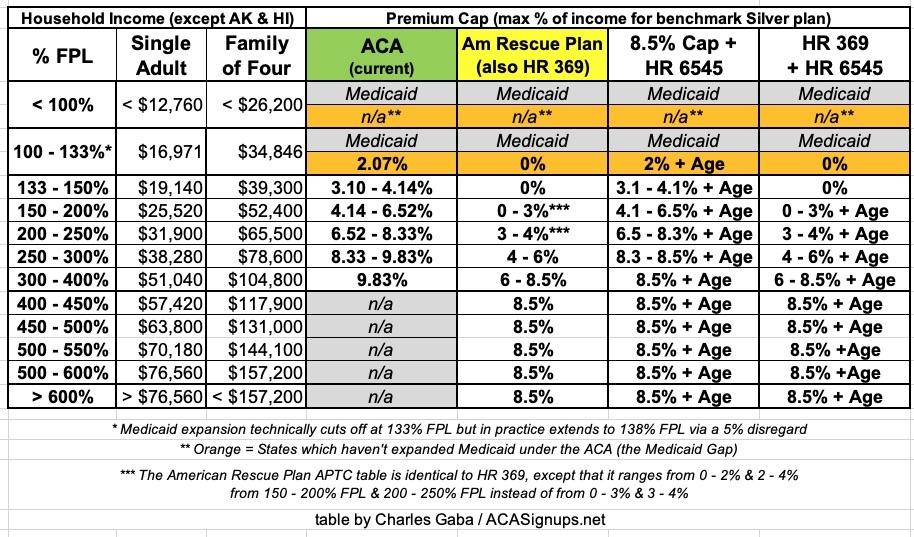 FIRST, the American Rescue Plan (which basically mirrors HR 369) is a damned good upgrade over the current APTC formula. It's already been passed and covers things through the end of 2022.
