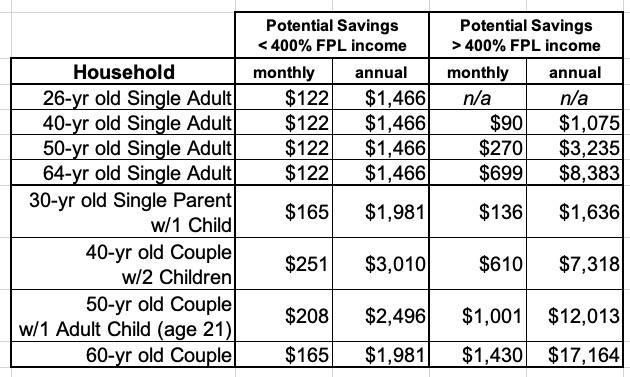 Here's a summary table listing the most that eight representative households could save based on the average 2021 benchmark Silver plan prices around the country. The savings below the 400% threshold may seem "low" compared to those over 400%, but that's because the <400% enrollees are already receiving much larger subsidies to begin with: