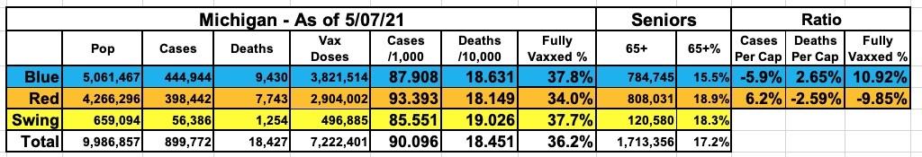 On the vaccine front, meanwhile...yep, as of today, Michigan's handful of large Blue counties (the 12 counties which voted for Biden last fall have 55% of the population) have vaccinated 36.2% of their residents, while the other 71 Trump-voting counties have only vaccinated 32.9% of theirs.
