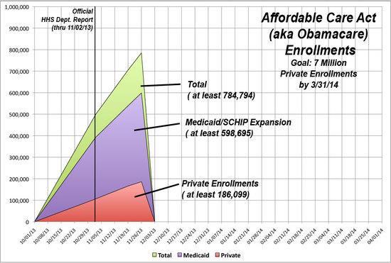 It's important to note that the graph is misleading--it makes it appear that enrollments are slowing down since the HHS report, but the chart only includes the states which have actually reported new figures since then (only 12 have so far), and even then those numbers don't run all the way up to today (some only go up to a few days past the HHS report period which ended on 11/02).