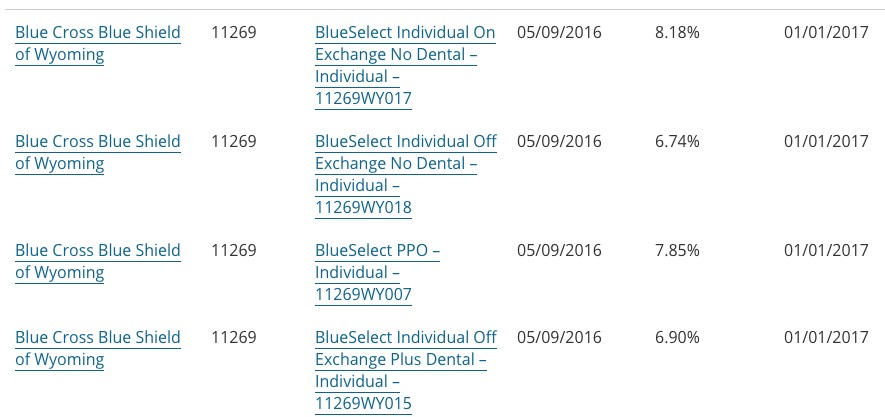 In any event, the bottom line is that BCBS of Wyoming is only requesting a 7.4% rate hike on average, which is the second lowest average so far (behind Rhode Island's 3.6%).