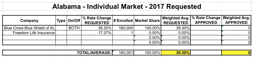 As I noted Monday, I believe August 1st was the deadline for every state to submit their 2017 rate filings, meaning that the 14 states missing from my Requested Rate Hike Project are finally available to be plugged into the spreadsheet. I'll also be going back through the other states I've been tracking since as early as April to see which ones require updates due to carriers dropping out, joining in or resubmitting their rate requests.