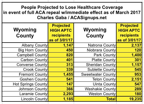 In the case of Wyoming, assuming 27,000 people enroll in exchange policies by the end of January, I estimate around 19,000 of them would be forced off of their policy upon an immediate-effect full ACA repeal.