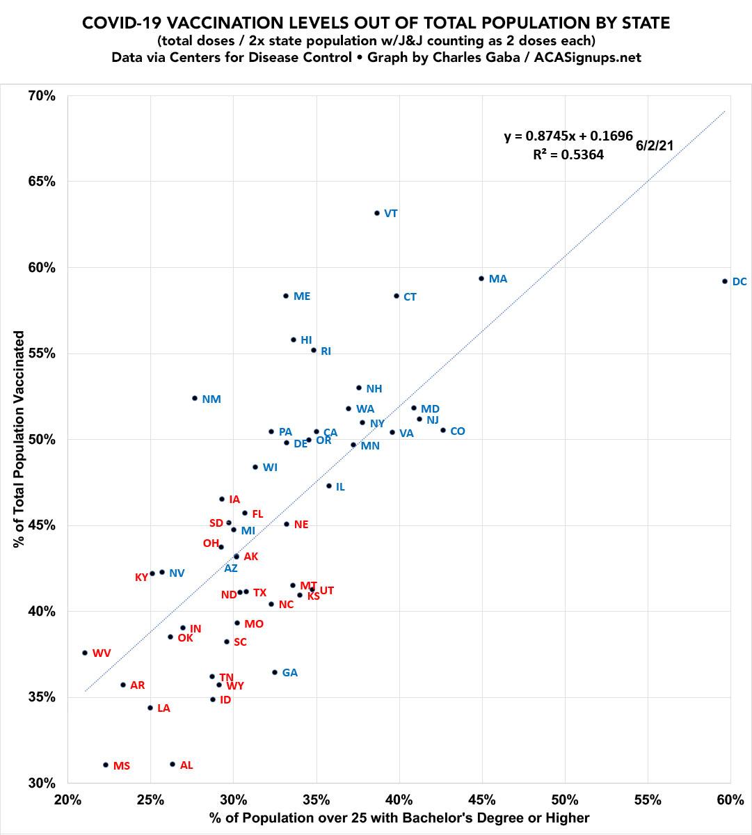 The vaccination levels for each state below are based on taking the total number of COVID-19 doses administered to date according to the Centers for Disease Control), then and dividing that into double the state population (since each person needs two doses to be fully vaccinated) as of April 2020 according to the U.S. Census Bureau.