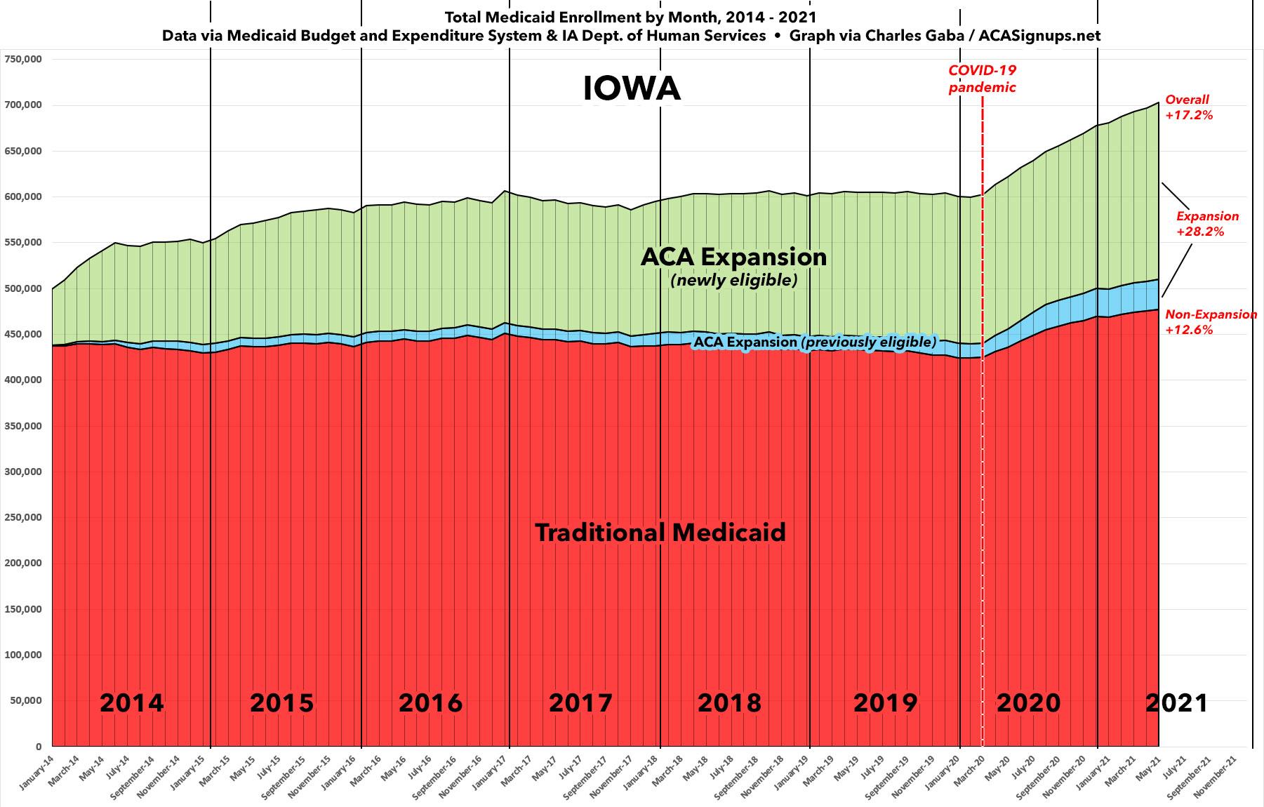After ACA expansion ramped up starting in early 2014, Iowa's overall enrollment in both traditional and ACA-expansion Medicaid has been remarkably steady, hovering around the 600,000 mark for more than 4 years straight...until COVID hit last spring. Since then, traditional Medicaid enrollment has increased by 12.6% and ACA expansion has gone up by 28.2%, for an overall climb of 17.2% as of May 2021.