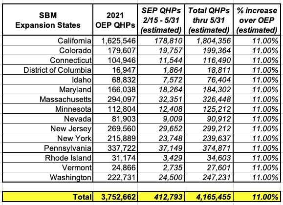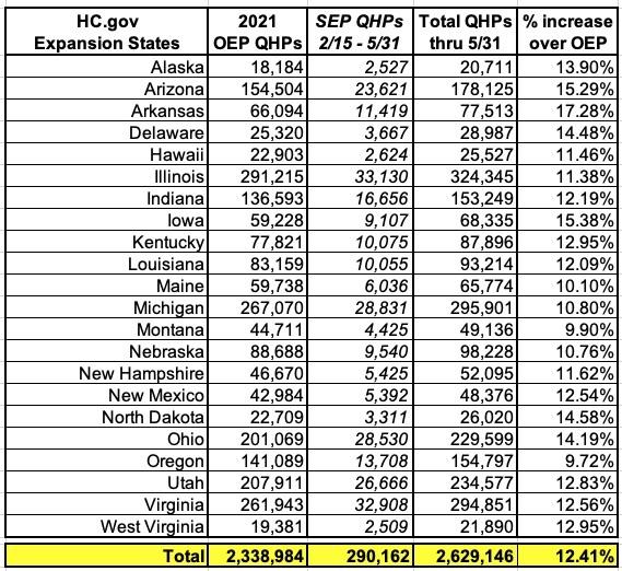 Next, here's the EXPANSION states on the federal exchange. As expected, adding SEP QHPs to these only increases the total by a lower amount...12.4%: