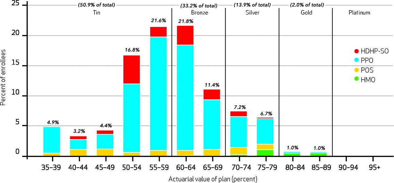 ...The average actuarial value for an individual plan was 60 percent ( Exhibit 2)—more than twenty percentage points less than that for group insurance (Exhibit 1 ). For families incurring the highest 1 percent of medical expenses, individual insurance covered 87 percent of the bill, compared to 33 percent for families in the lowest half of spending. There were no platinum plans in our sample of individual plans, and the majority of enrollees were in a tin plan.