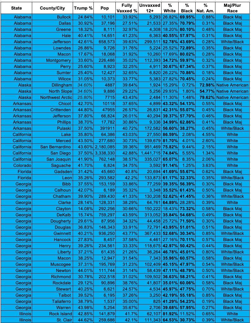 Needless to say, there's a serious problem here. On average, only 41% of the total populations of these counties have been vaccinated so far. Considering that only 15% of the Black population nationally say that they refuse to get vaccinated, this seems to be a situation where at least 30-40% or so of the rest of the population is willing to get vaccinated...IF issues of access, transportation, time off of work etc. are resolved.