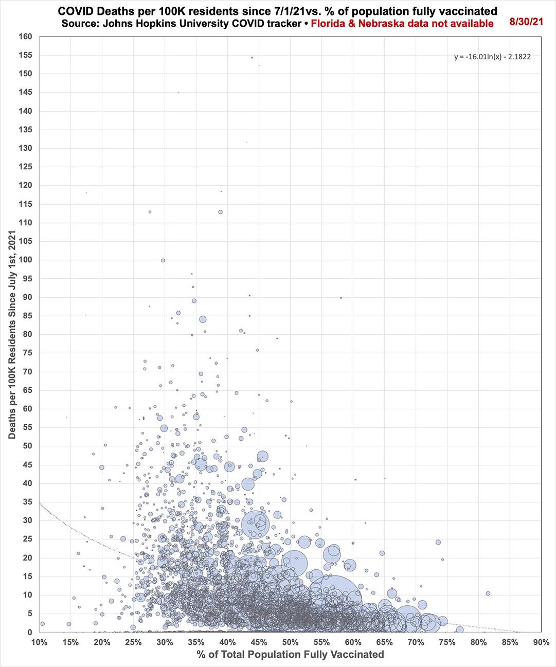 First, his graph doesn't include Nebraska, Florida or Alaska--the first two because they stopped releasing county-level death data earlier this summer; the third because Alaska publishes their voter data based on legislative districts, not boroughs or census areas.