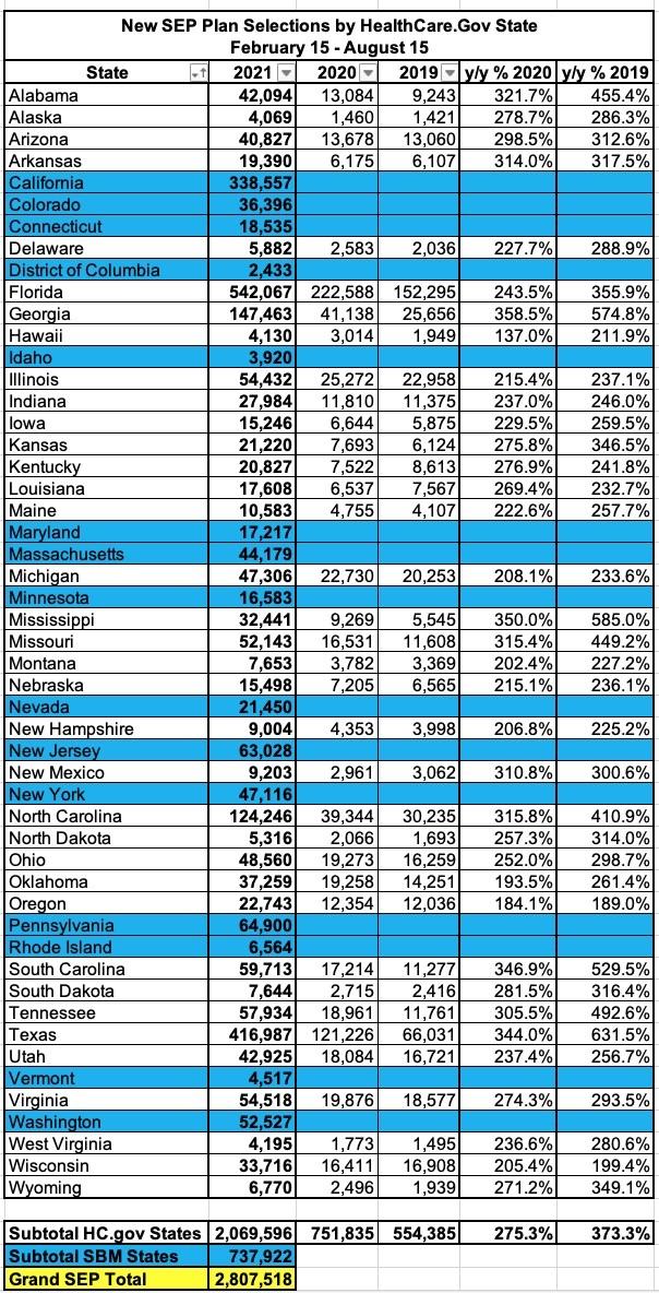 According to the official SEP report, the exact number of new enrollees nationally during the 2021 SEP from 2/15/21 - 8/15/21 was 2,807,518, so I was off by 52,482 enrollees. From the breakout below, it looks like HC.gov enrollments were about 20,000 higher than I expected, while SBE enrollments were around 70,000 lower. Ah, well.