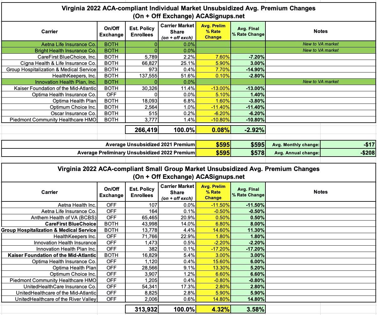 Virginia: Approved avg. 2022 #ACA rate changes: -2.9% indy market; +3.6% sm. group; 3 new carriers join market