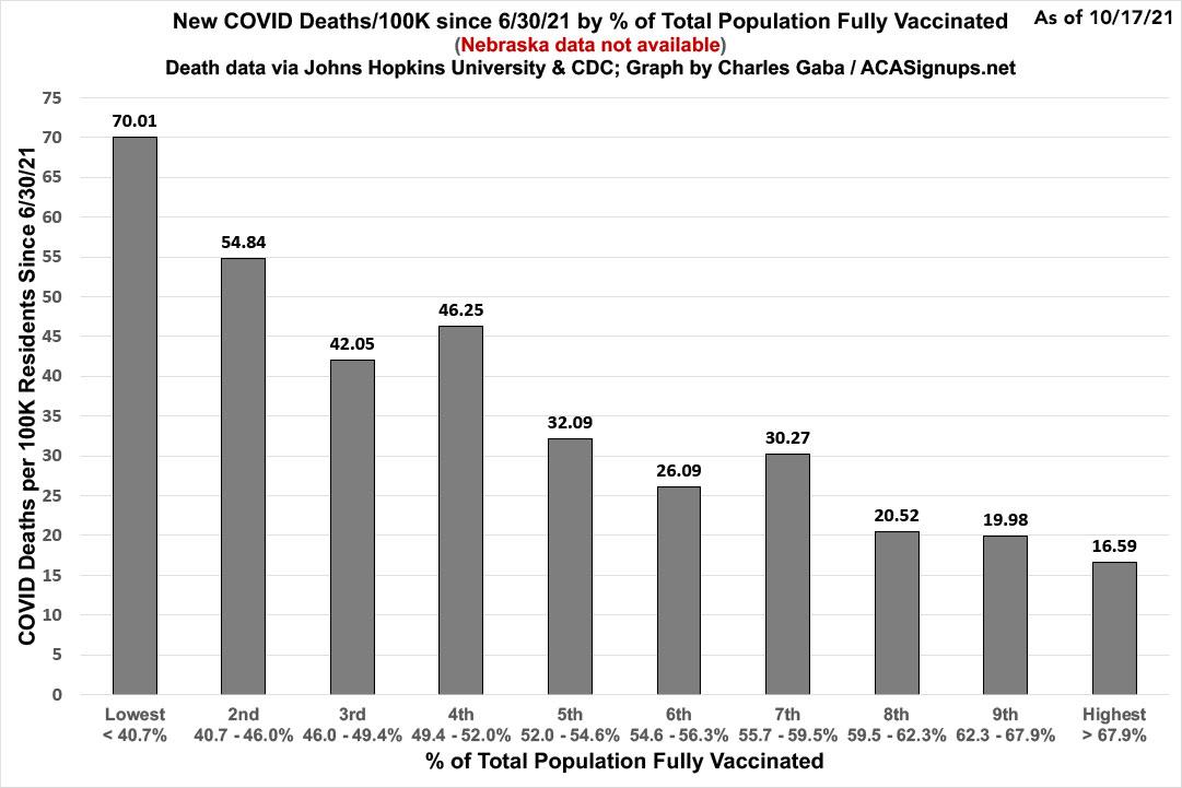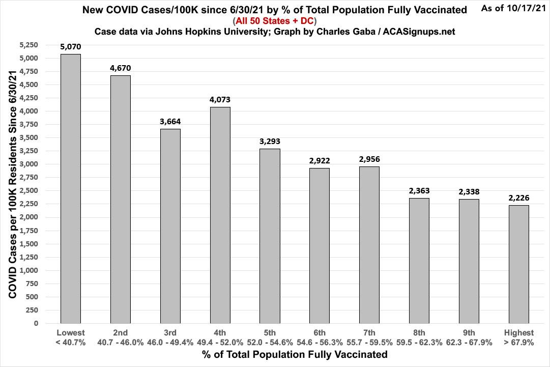 As you can see, case rates since June are 2.28x higher in the least-vaccinated tenth of the country (under 40.7% fully vaccinated) than in the most-vaccinated tenth (67.9% or higher)...