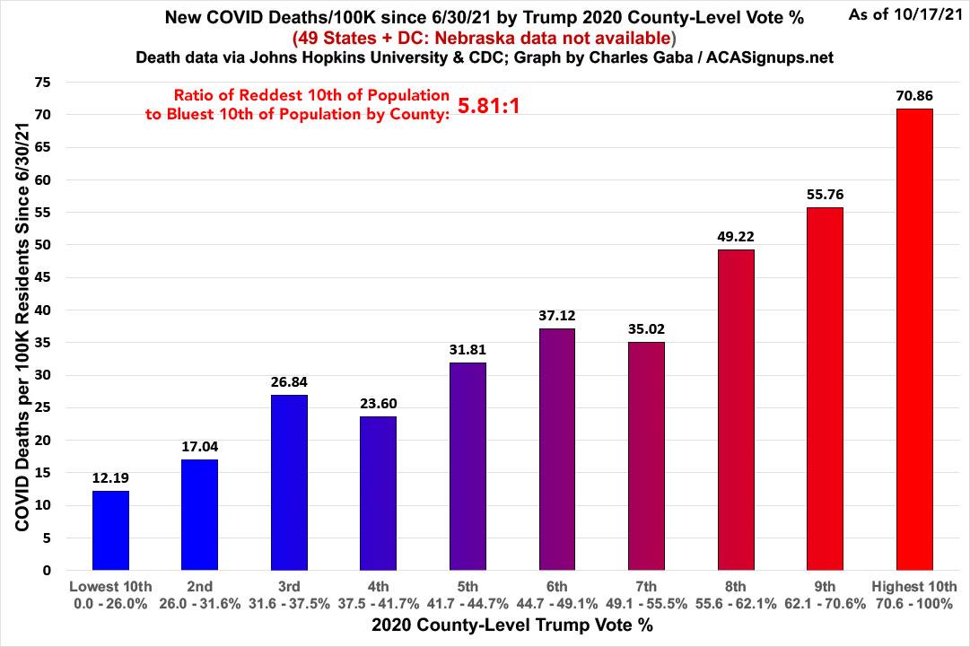 Here's the weekly look at the rate of COVID-19 cases & deaths at the county level since the end of June, broken out by partisan lean (i.e, what percent of the vote Donald Trump received in 2020).