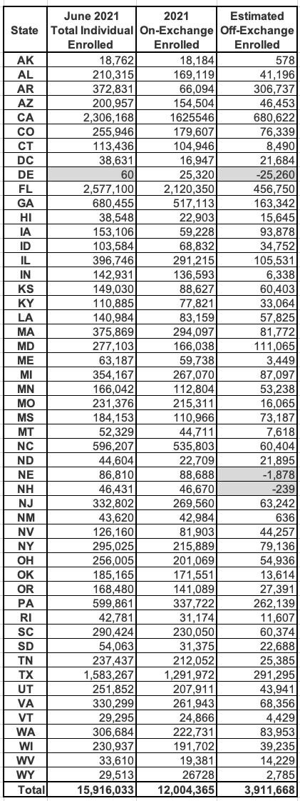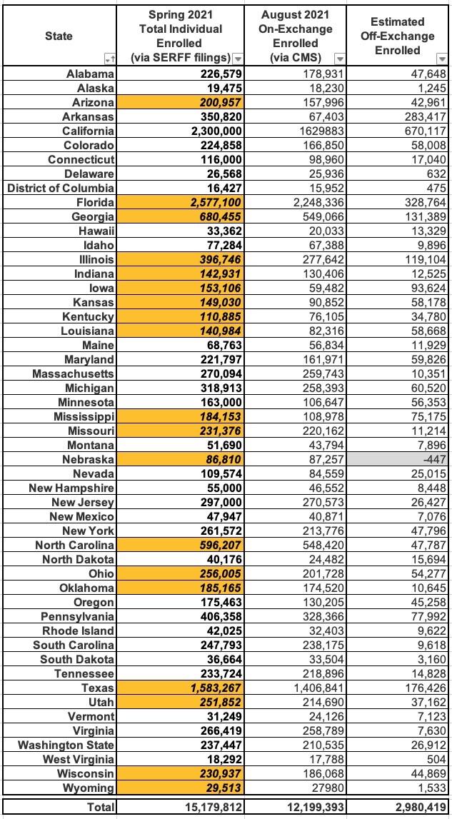 Assuming this is fairly accurate, it puts the total ACA-compliant individual market as of Summer 2021 at 15.2 million people, with 12.2 million on-exchange and around 3.0 million off-exchange nationally.
