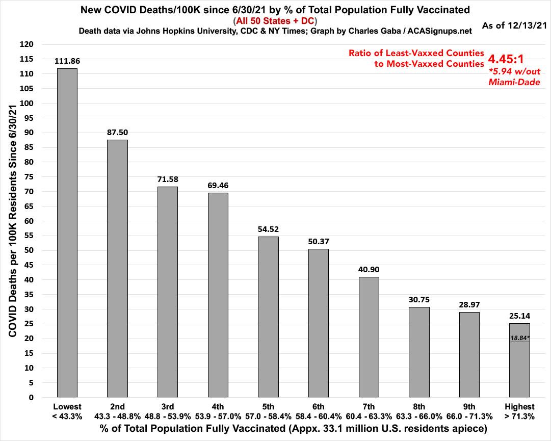 ...while when you look at the death rates, the contrast is even more stark: Death rates in the least-vaxxed tenth are 4.45x higher than in the most-vaxxed tenth. If you disregard Miami-Dade County entirely, it's a whopping 5.9x higher:
