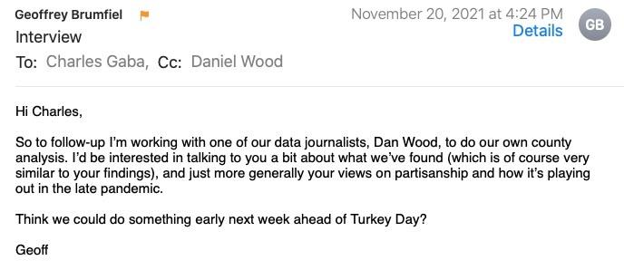 HOWEVER, when you contact a fellow data analyst specifically because they're working on the same data, then request a lengthy meeting with them in order to speak with them about their work and their methodology, and then follow up with them in order to schedule a second lengthy meeting to discuss the same work again, and then follow up with them a third time to clarify other details, it's generally considered professional to mention them at least once in the final piece you publish on your far higher-profile platform.