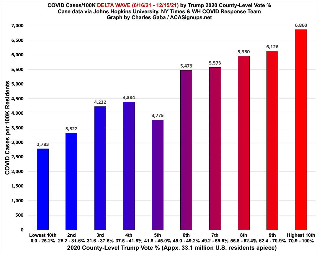 FIRST, here's my final Delta wave graphs, which run from June 15th, 2021 - December 15, 2021. For that period of time, new COVID-19 case rates ran 2.46x higher in the reddest tenth of the U.S. than the bluest tenth...while COVID-19 death rates ran 5.77x higher: