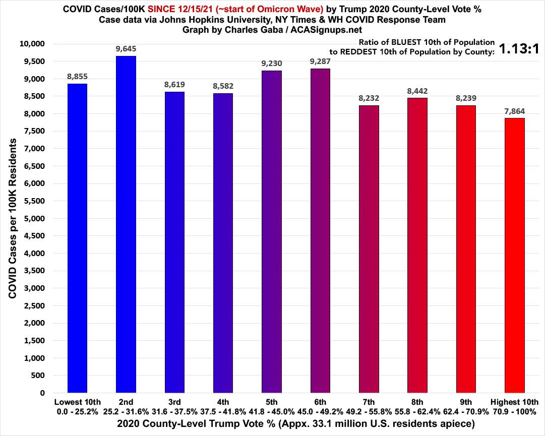 First, the partisan breakout: The case rate ratio is a very different picture under Omicron. For the first two months of Omicron, case rates are 1.13x higher in the BLUEST decile than the reddest: