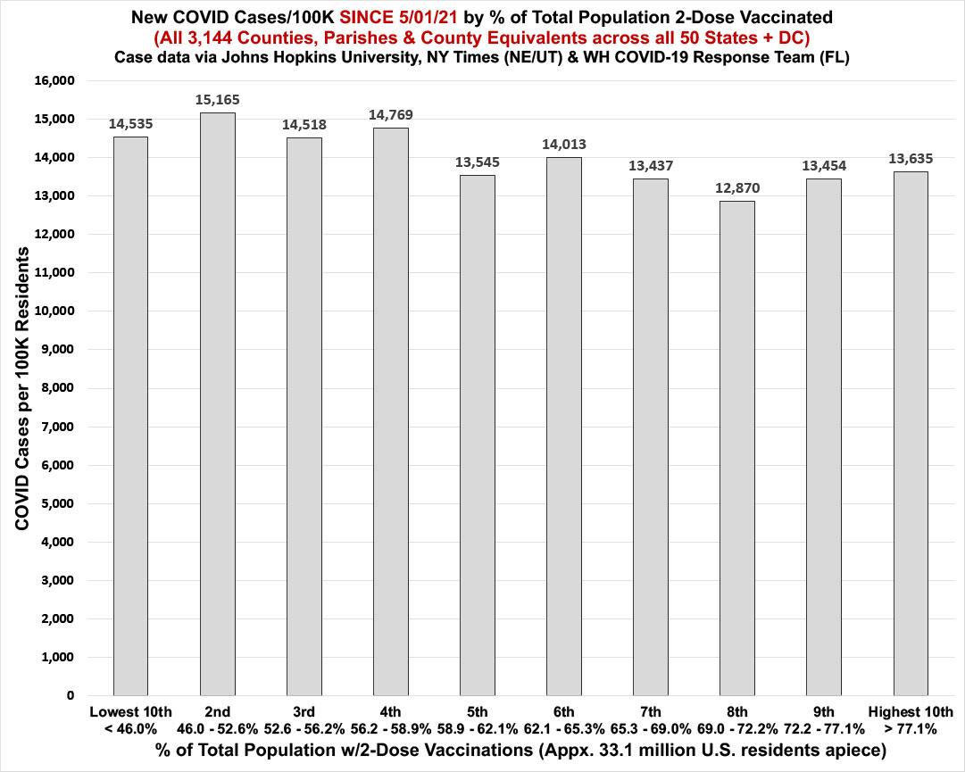 First, let's look at vaccination rates. These bracket sizes change slightly from week to week as more people in every bracket join the "2nd shot vaccinated" population, but for the most part they're pretty stable relative to each other. As you can see, since May 1, 2021, the official cumulative case rate hasn't actually varied much whether a given county has a high or low vaccination rate.