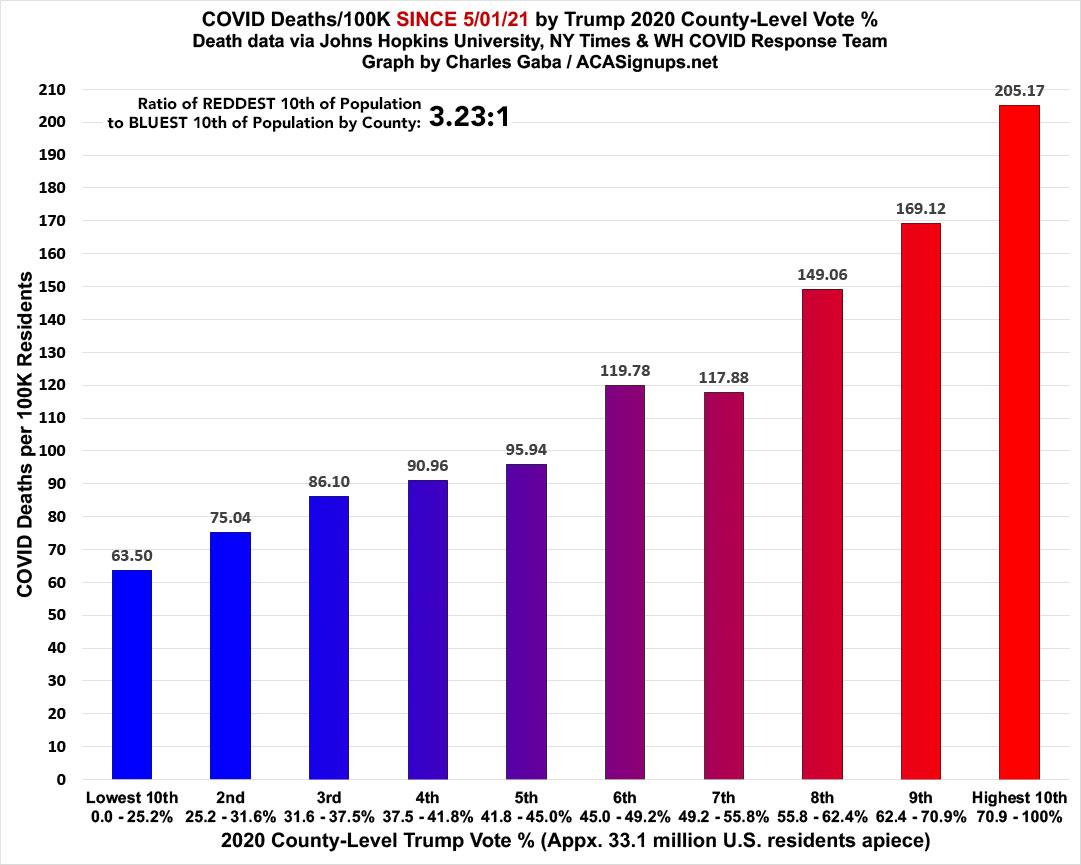 ...HOWEVER, when it comes to death rates, there's still a clear and dramatic correlation between how much of the population has been 2-dose vaccinated and its COVID death rate since last May. The least-vaccinated decile has a death rate nearly 3.3x higher than the most-vaccinated decile: