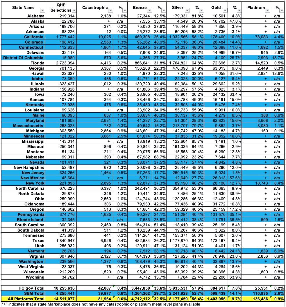 In this entry, I'm looking at the metal level breakout of the plans selected by ACA exchange enrollees. As a reminder, ACA policies fall into four categories: Bronze, Silver, Gold, Platinum, plus a special fifth "Catastrophic" category.