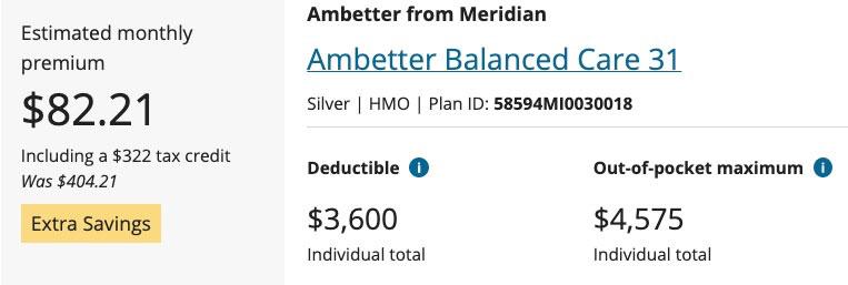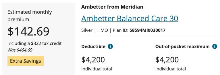 The 2nd-to-last bullet above is the real killer (no pun intended): The smoker surcharge is not included when your tax credits are calculated. Here's an example of how big a difference this can make: A 50-year old single adult earning $30,000/year in Oakland County, Michigan. It's important to note that Ambetter appears to only charge a 15% smoker surcharge, far less than the 50% that they're allowed to under the Affordable Care Act: