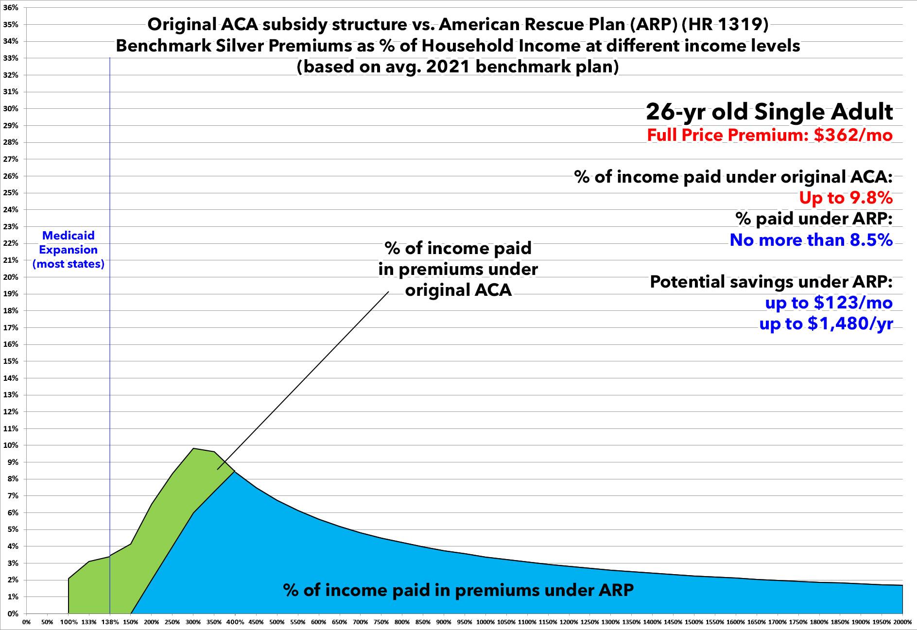 Here's a 26-yr old single adult. Under the American Rescue Plan, they're currently paying no more than 8.5% of their income...and if they earn less than $20,385/year, they don't have to pay anything in premiums.