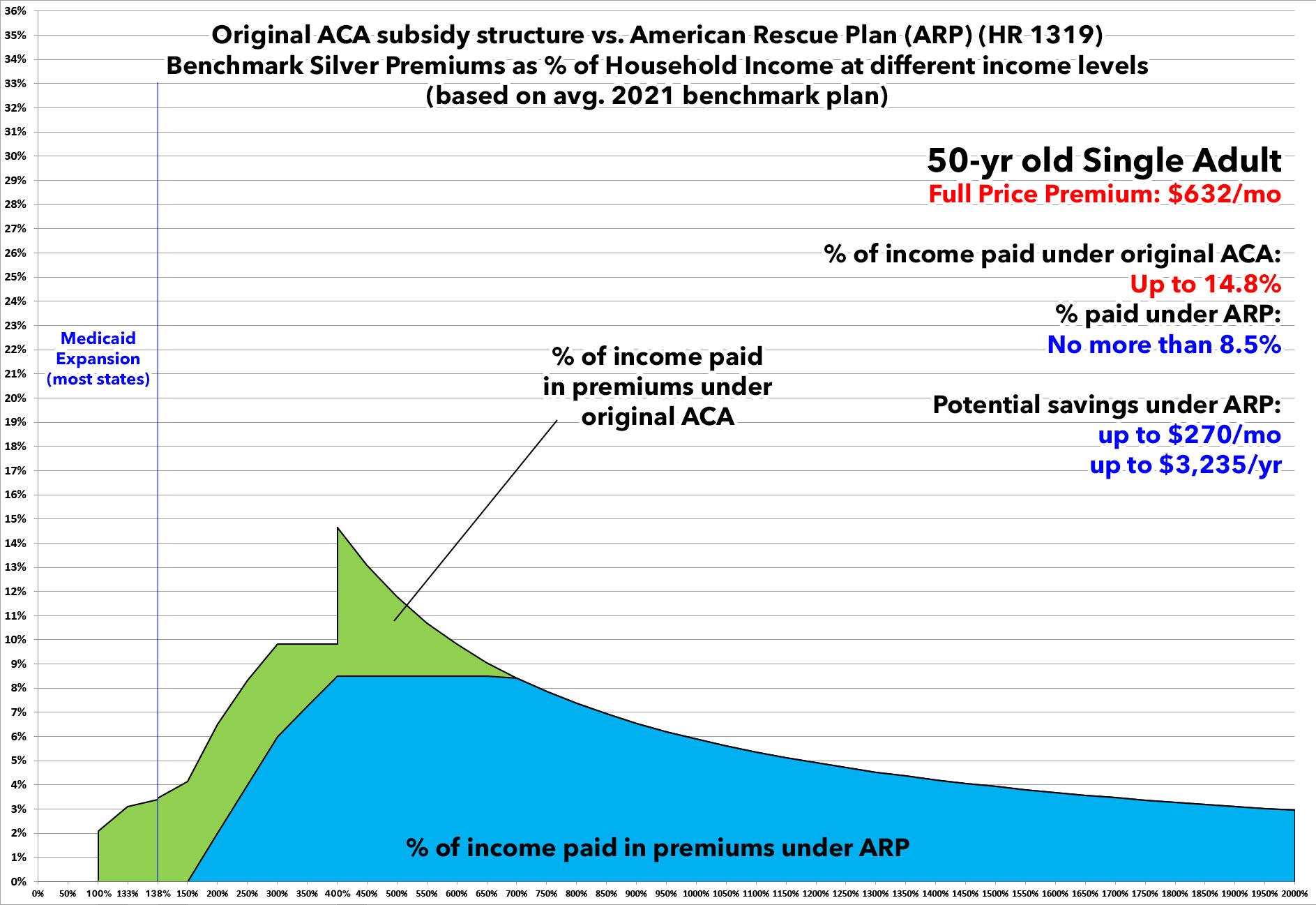 Under the expanded American Rescue Plan subsidy structure, they only have to pay a maximum of 8.5% of their income for the benchmark Silver ACA plan.