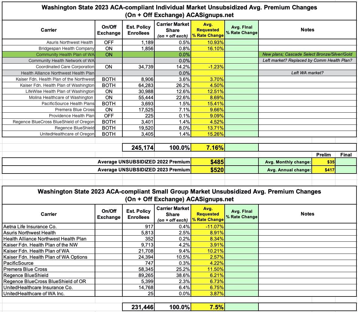 Washington State: (Preliminary) Avg. Unsubsidized 2023 #ACA Rate Change: +7.2%