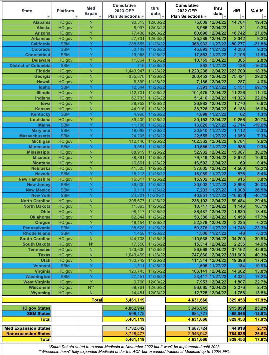 As I noted earlier today, the Centers for Medicare & Medicaid Services have released an updated 2023 ACA Open Enrollment Period data report, which runs through 12/03/22 for the 33 states hosted by the federal exchange and 11/26/22 for the 18 states which operate their own exchanges.