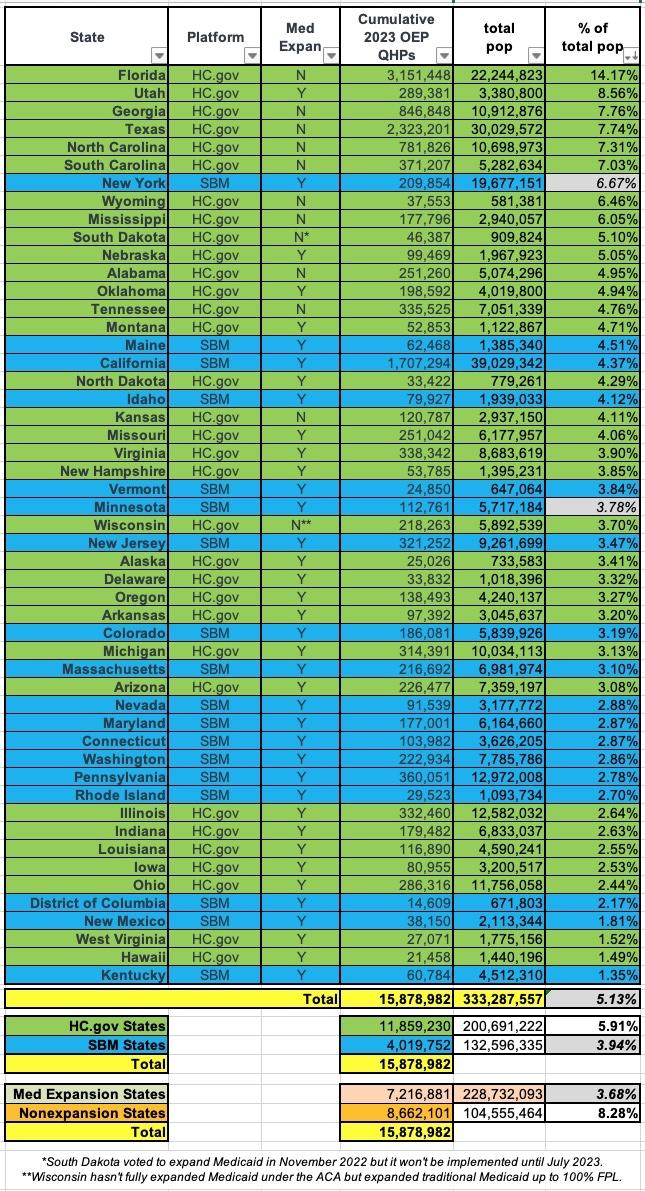 What about the other states? The table below sorts total 2023 OEP enrollment as of either 1/07/23 for federal exchange states (HC.gov) or 12/31/22 for state-based marketplace states (SBM) by what percent of the total state population has signed up so far. For New York and Minnesota the percent of total population includes each states Basic Health Plan (BHP) enrollment as well, since everyone enrolled in those plans would normally be eligible for a QHP instead: